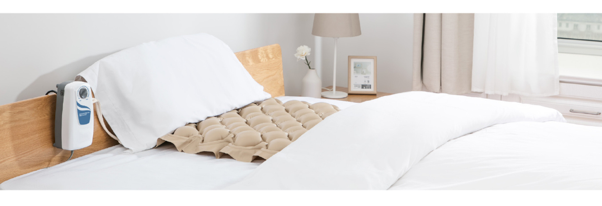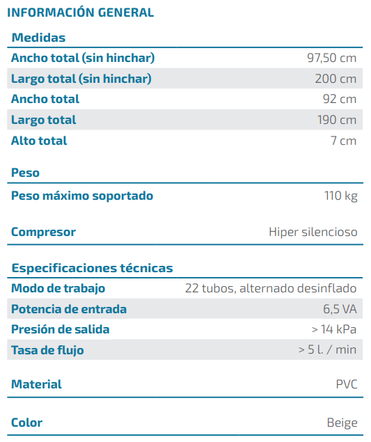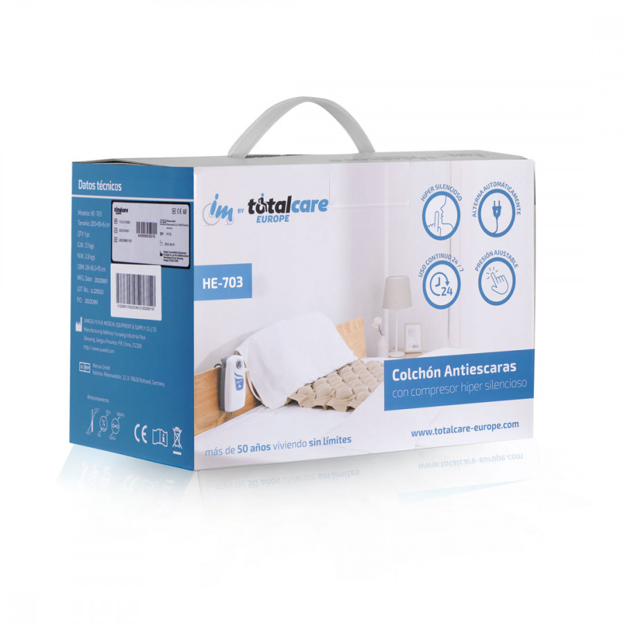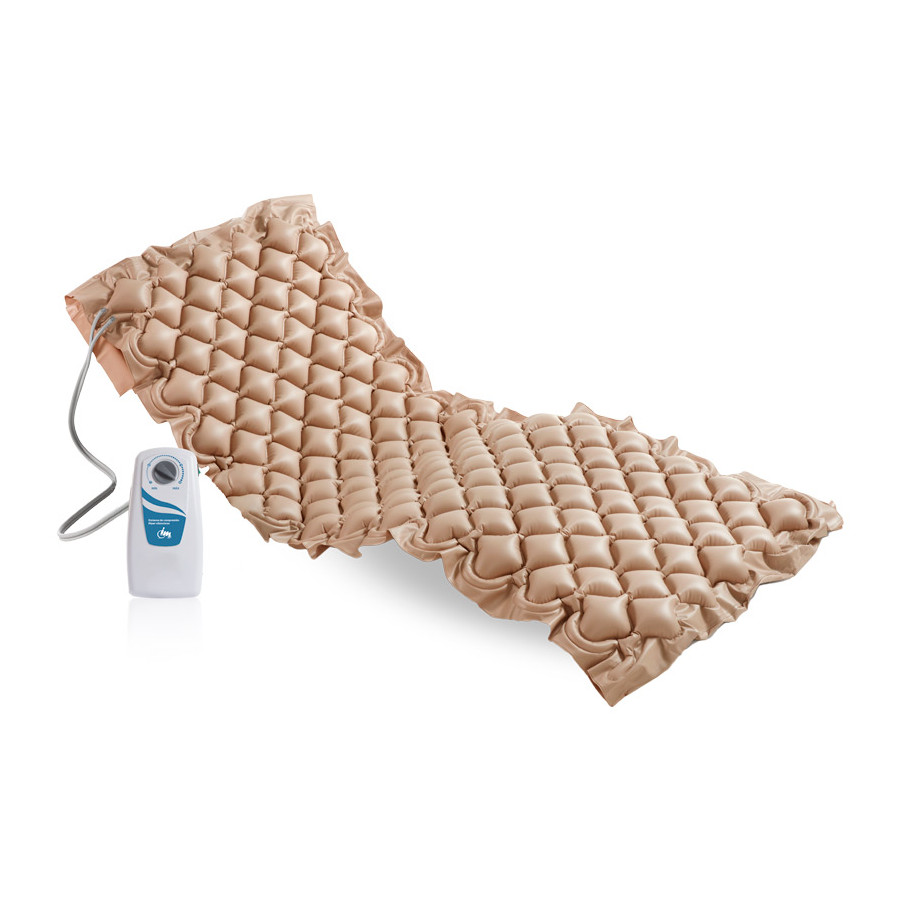 El compresor hincha y deshincha los diferentes compartimentos del colchón realizando una alternancia y cambiando los puntos de presión sobre los que descansa el paciente.