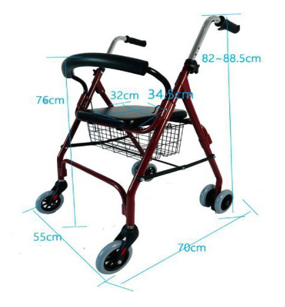 Andador con estructura de aluminio ligero, frenos incorporados, puños regulables en altura y cesta metálica. Ayuda a personas con movilidad reducida a desplazarse de forma cómoda, segura y estable, además dispone de un asiento, barra-respaldo acolchada para descansar.
