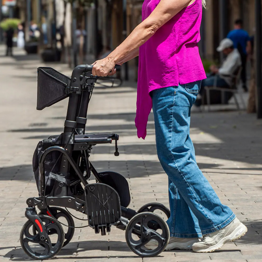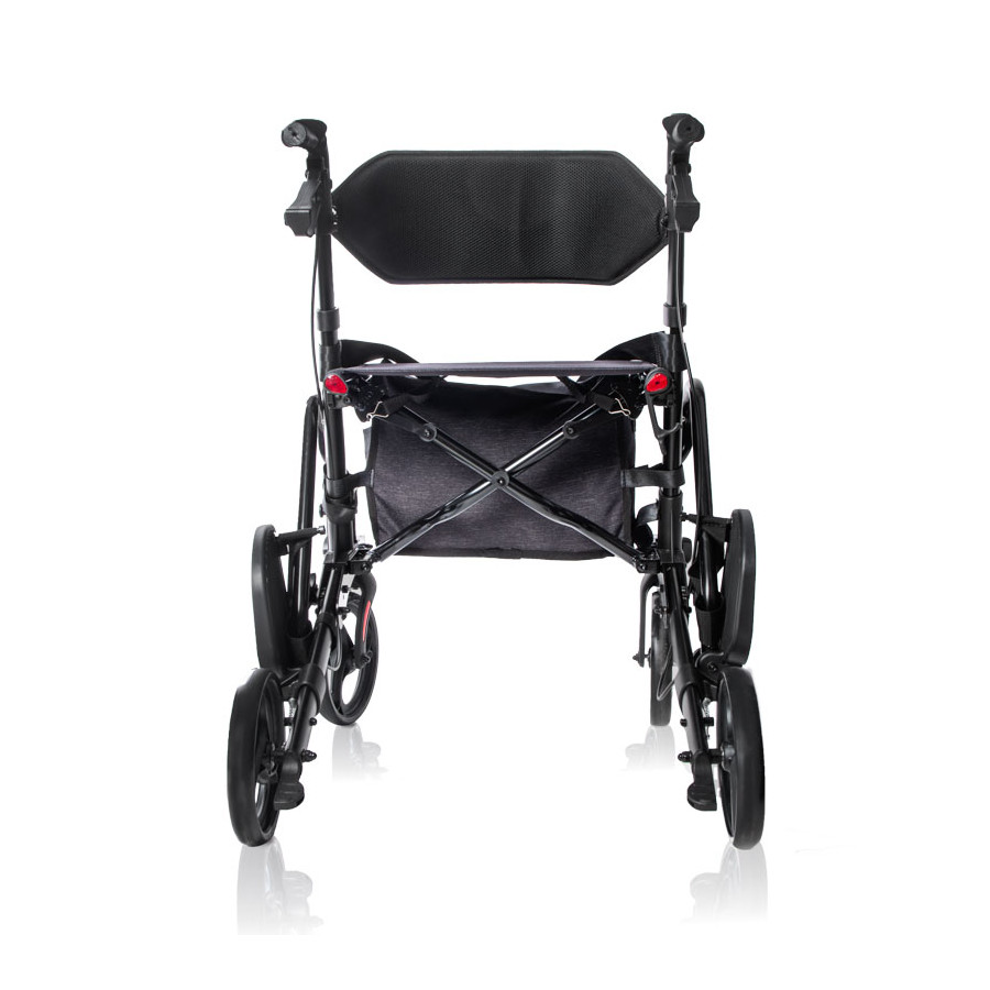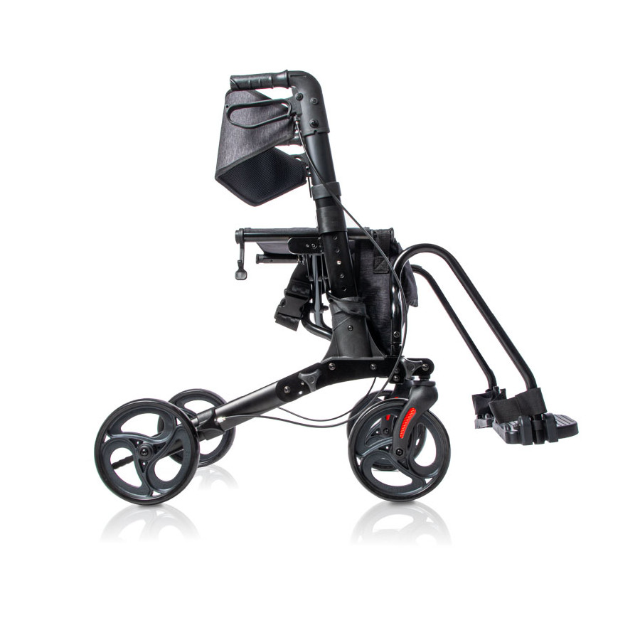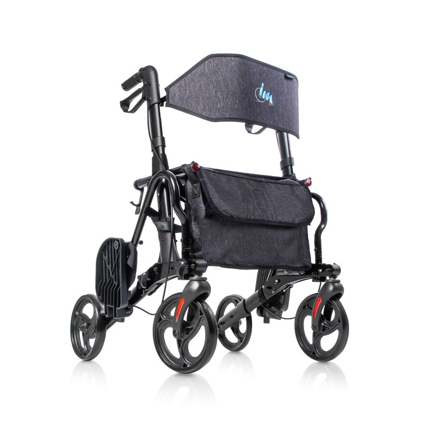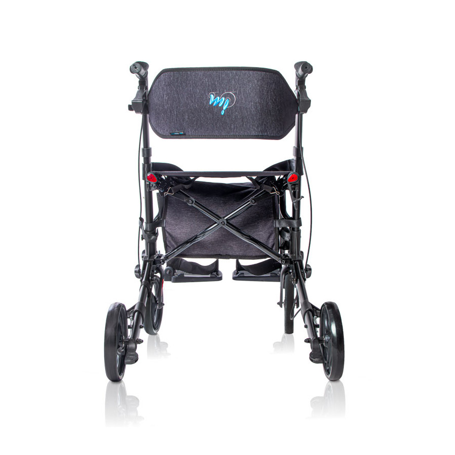 Cuenta con respaldo abatible que permite girarlo fácilmente según las necesidades del usuario, facilitando la conversión entre modo andador y silla de ruedas. Además, su acolchado proporciona un plus de comodidad cuando el usuario está sentado.