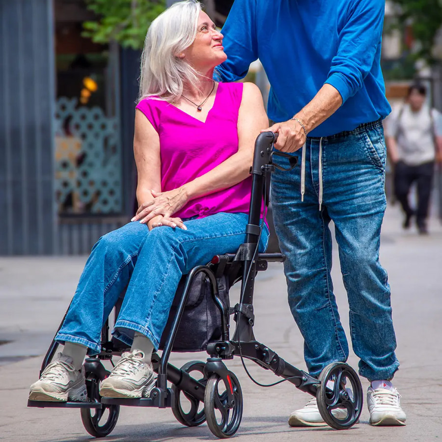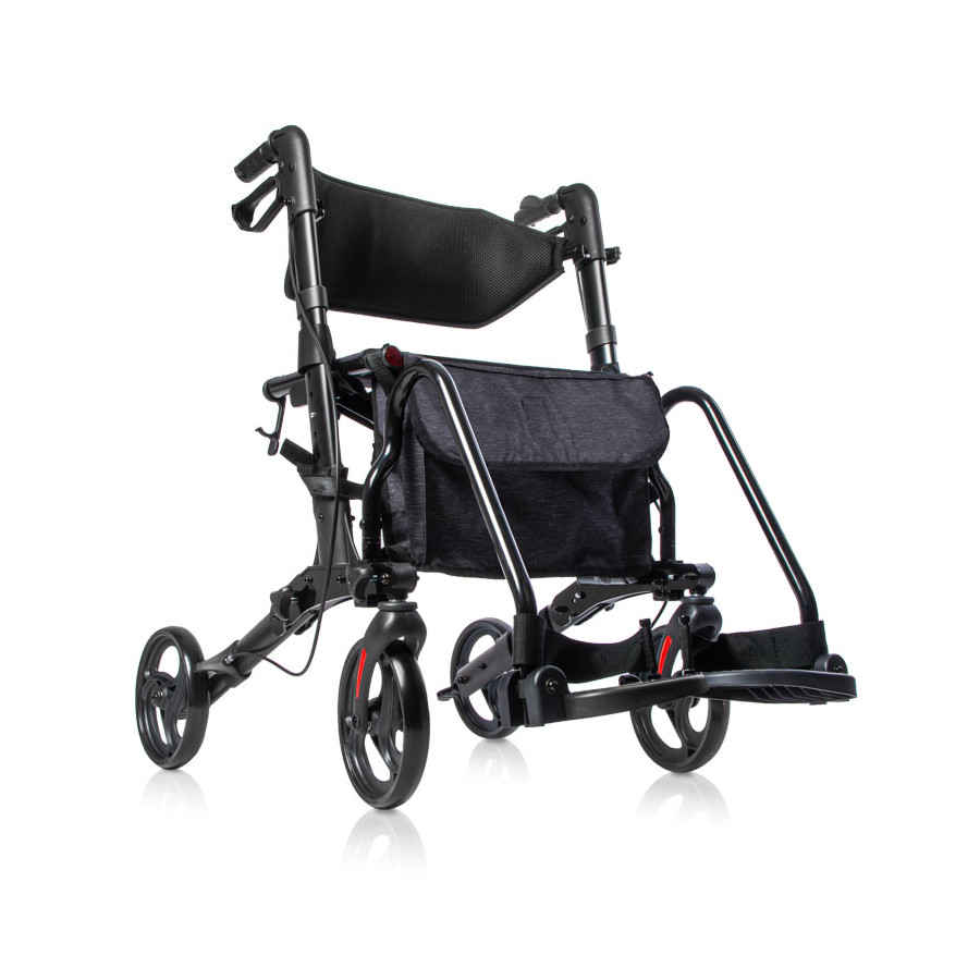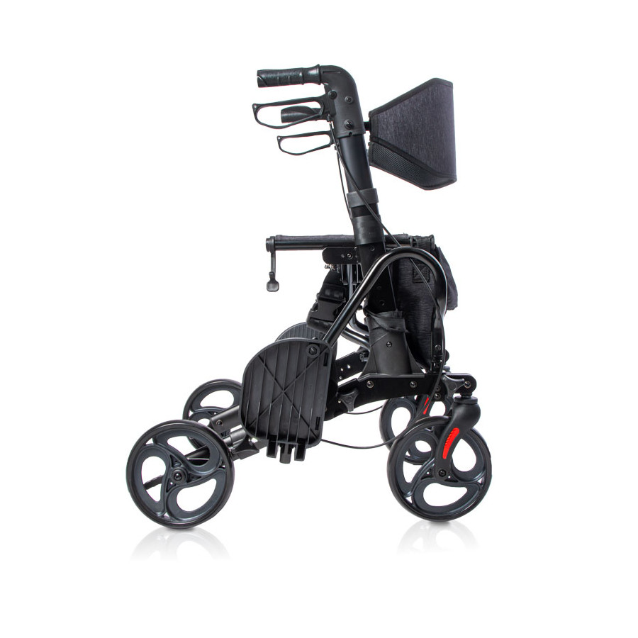 Este modelo destaca por incorporar de serie reposapiés regulables en altura, lo que permite transformarlo fácilmente en una silla de ruedas manual. Con solo abatir el respaldo y girar los reposapiés, el usuario puede sentarse de forma cómoda y segura, adaptando la posición según sus necesidades.