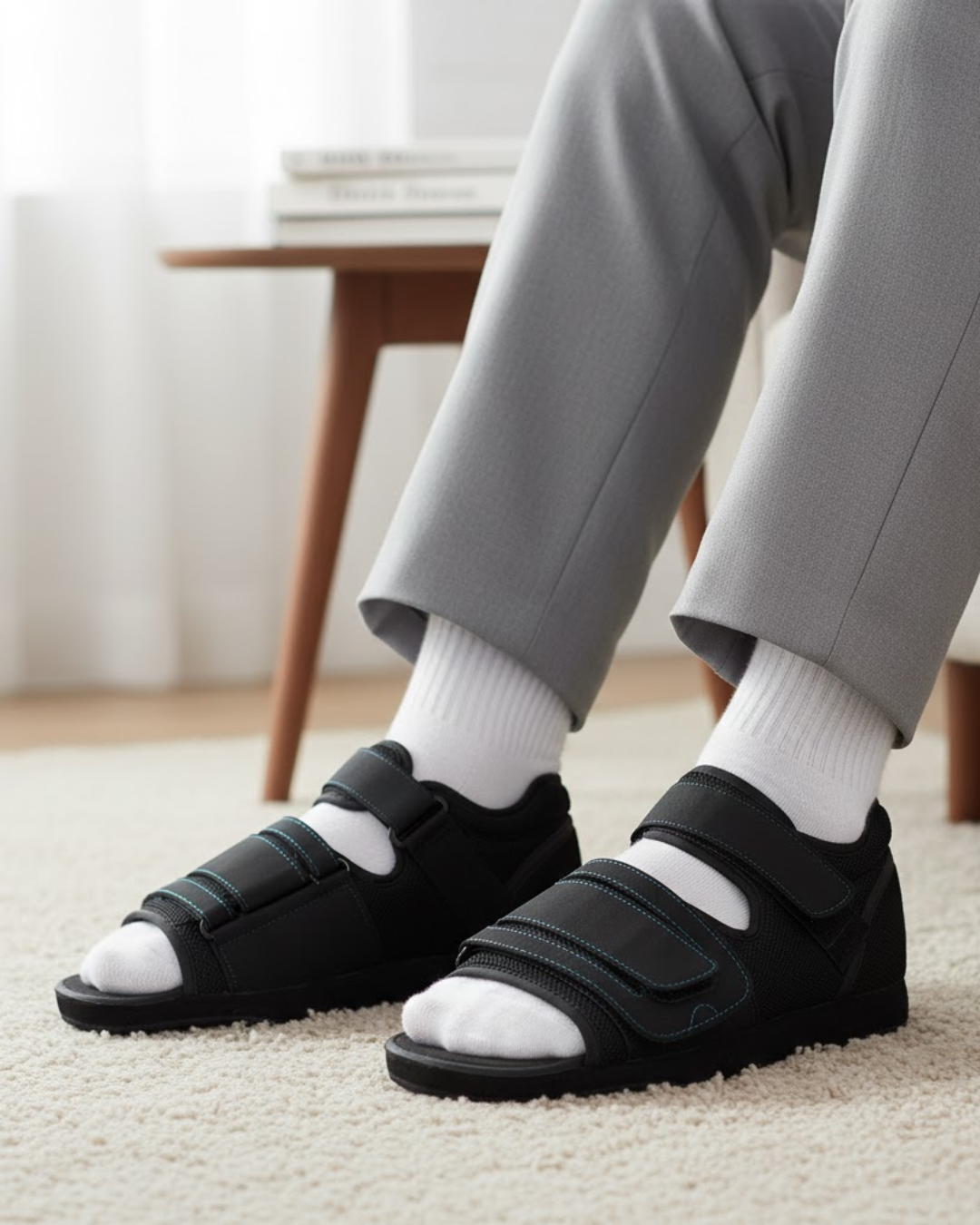 Protege y mantiene el pie en la posición correcta durante la recuperación. Especialmente indicado para post-cirugías de pies y dedos, pies escayolados, vendajes inmovilizantes y edemas donde no es posible usar calzado convencional. Su sujeción extra al tobillo brinda mayor estabilidad y seguridad.