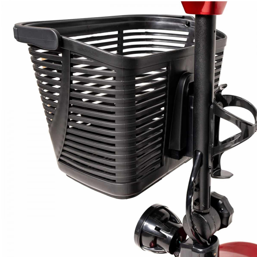 Dispone de reposabrazos abatibles. Asiento acolchado giratorio a 360°y regulable en altura. Columna de dirección ajustable en ángulo. Barra tipo delta para mayor ergonomía. Con cesta extraíble.