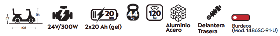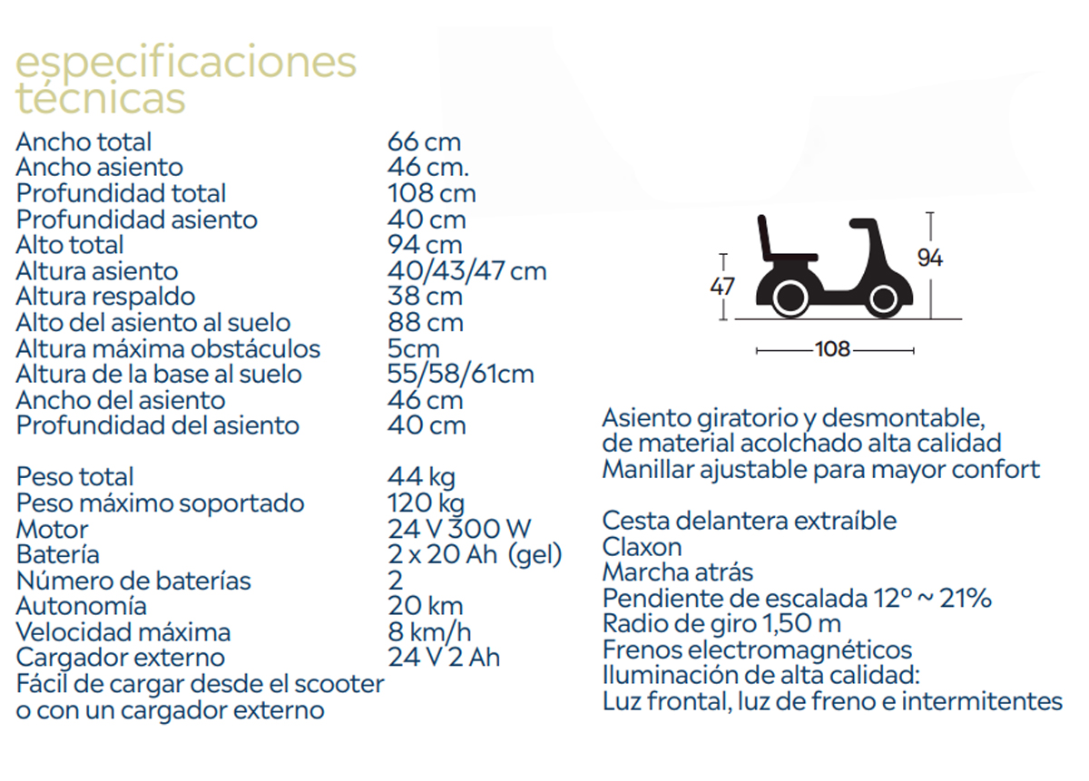 Permite al usuario recorrer largas distancias cómodamente con total independencia. Muy compacto, maniobrable y con excelentes resultados en todos los terrenos gracias a su motor de 300w y a sus dos baterías de 20 Ah. Alcanza 8 Km/h. Ideal para todo tipo de terreno con ruedas más grandes (210x65).