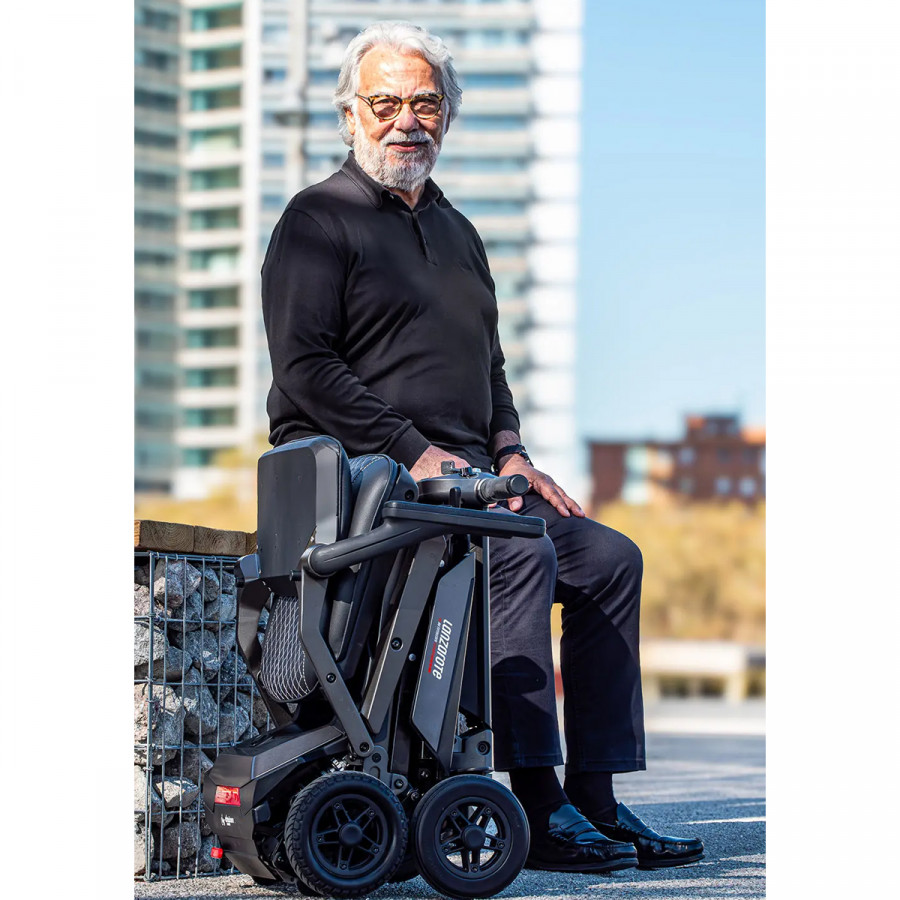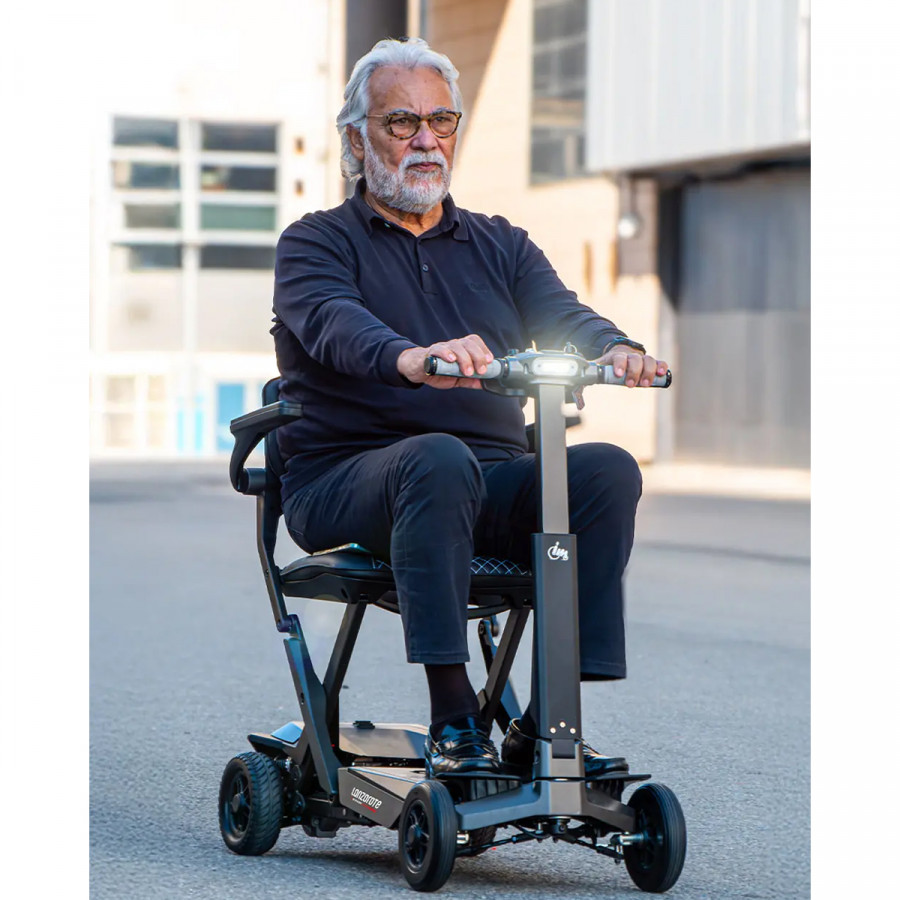 Gracias a su sistema de plegado electrónico, el scooter puede cerrarse cómodamente desde el joystick o mediante el mando bluetooth, sin esfuerzo.