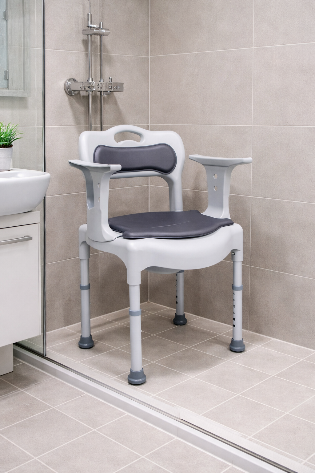 Esta silla de baño para personas mayores o con movilidad reducida es una ayuda esencial en hogares, hospitales, residencias y centros de rehabilitación, proporcionando autonomía y seguridad en las tareas de higiene personal.