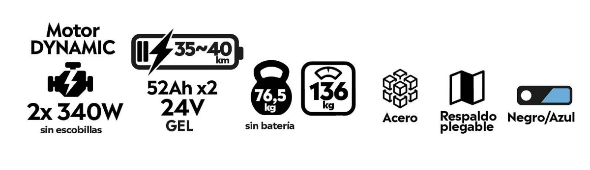 Las ruedas diseñadas para un mejor agarre en todo tipo de terreno y la suspensión trasera aporta mejor experiencia el terreno irregular (pendiente superable 10° y obstáculos 5 cm). Las baterías de gran capacidad (2X 52Ah) para un máximo rendimiento (autonomía de 35/40 km).