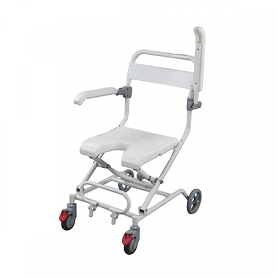 Su estructura de aluminio ligera y resistente permite un fácil manejo, mientras que el asiento de plástico PE moldeado ofrece confort y durabilidad. Gracias a sus reposabrazos y reposapiés abatibles, el usuario puede realizar transferencias de manera segura, práctica y sin esfuerzo. ♿