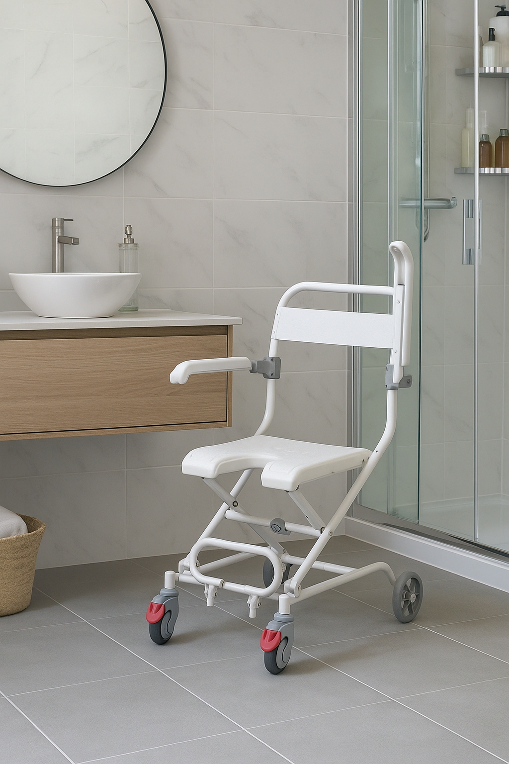 La Silla de baño plegable con reposabrazos abatible U360 combina comodidad, seguridad y funcionalidad para facilitar el aseo personal de personas con movilidad reducida o en procesos de rehabilitación. 💙